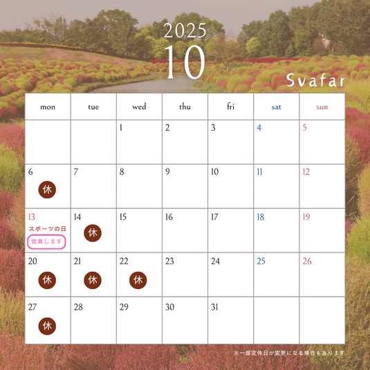 2025/10/02 10月のお休み いつもスバファーをご愛顧頂きましてありがとうございます。 10月のお休みをお知らせいたします 【10月の定休日】 6日(月) 14日(火) 20日(月)・21日(火)・22日(水) 27日(月) 宜しくお願い致します。 tagPlaceholderカテゴリ: