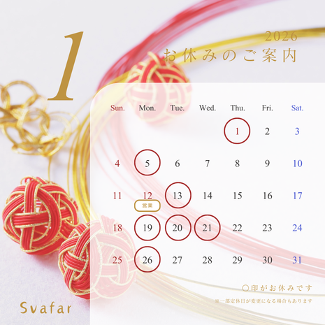 2026/01/01 1月のお休み あけましておめでとうございます 2026年も引き続きご愛顧の程宜しくお願いいたします 1月のお休みをお知らせします ■1月のお休み 5日・13日・19日・20日・21日・26日 ※12日の月曜日は営業を行います 宜しくお願いします。 tagPlaceholderカテゴリ: