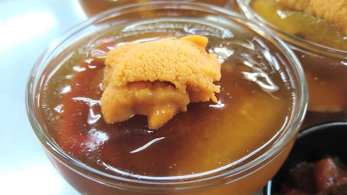 生ウニと活車海老のコンソメジュレ寄せ